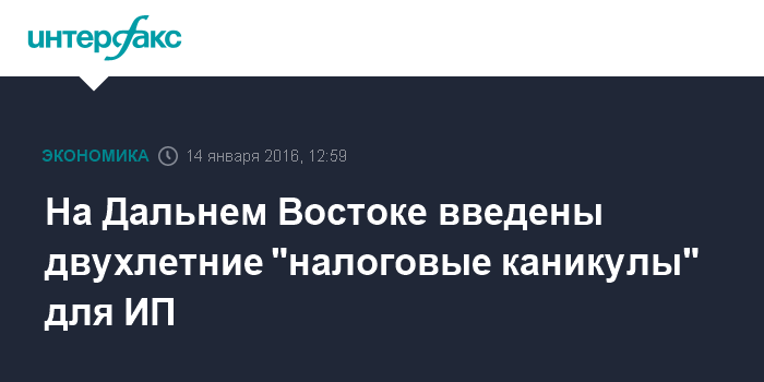Москва. 14 января. INTERFAX.RU – Двухлетние "налоговые каникулы" введены для индивидуальных предпринимателей на Дальнем Востоке, говорится в сообщении Минвостокразвития.