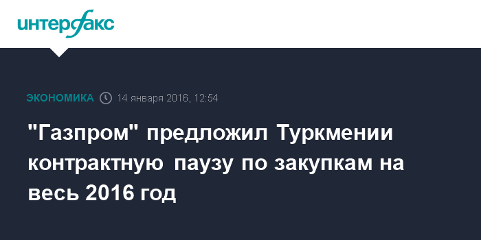 Москва. 14 января. INTERFAX.RU – "Газпром" предложил "Туркменгазу" ввести контрактную паузу по закупкам газа на 2016 год, сообщил "Интерфаксу" источник, близкий к переговорам.