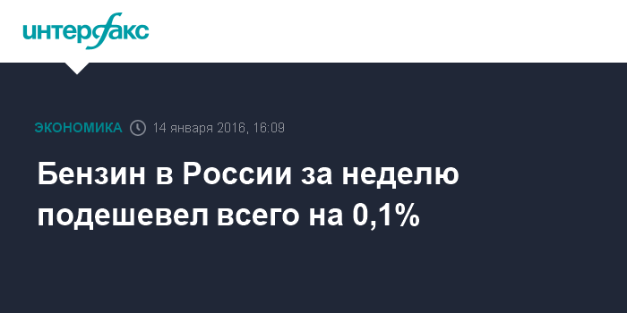 Москва. 14 января. INTERFAX.RU – Потребительские цены на бензин в России с 29 декабря по 11 января понизились на 0,1%, сообщил Росстат. За предыдущую неделю снижение цен составило также 0,1%, до этого две недели подряд цены снижались по 0,3%.