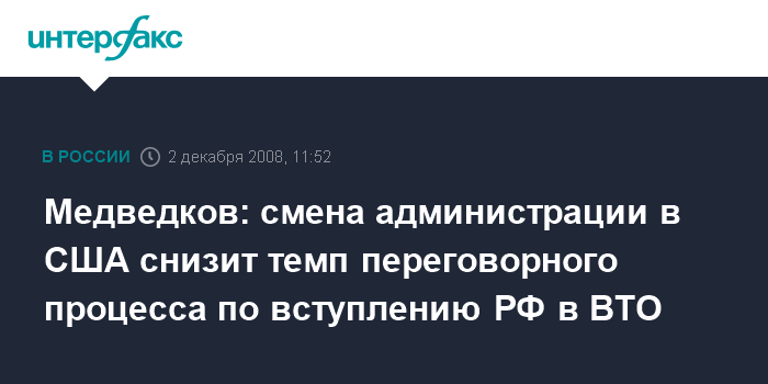 Москва. 2 декабря. INTERFAX.RU - Смена администрации в США неизбежно снизит темп переговорного процесса по присоединению РФ к ВТО, считает глава российской делегации на переговорах Максим Медведков.