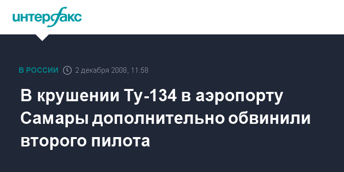 Москва. 2 декабря. INTERFAX.RU - Отдел по расследованию особо важных дел СУ СКП РФ по Самарской области предъявил обвинение пилоту второго класса Андрею Лапанову, который помогал управлять командиру самолета Ту-134, рухнувшему в аэропорту Самары в 2007 году. Тогда погибли шесть человек.