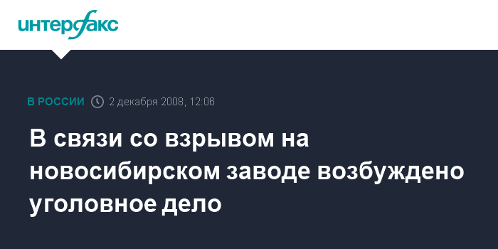 Москва. 2 декабря. INTERFAX.RU - По факту взрыва на Новосибирском заводе искусственного волокна в Искитиме, унесшем жизнь одного человека, возбуждено уголовное дело.