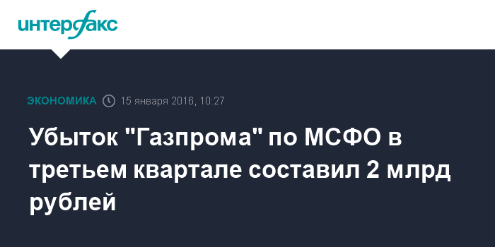 Москва. 15 января. INTERFAX.RU – Чистый убыток "Газпрома" по МСФО в третьем квартале 2015 года составил ровно 2 млрд рублей (за июль-сентябрь 2014 года была прибыль 105,676 млрд рублей), сообщила компания.