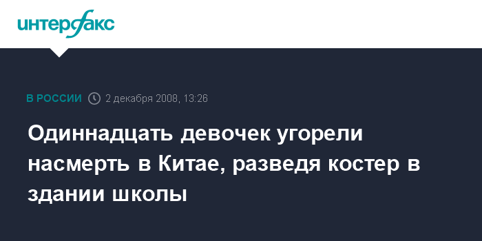 Москва. 2 декабря. INTERFAX.RU - Одиннадцать учениц школы города Юйлинь провинции Шэньси (центральная часть Китая) погибли в результате отравления угарным газом, еще одна находится в больнице, сообщают китайские СМИ.