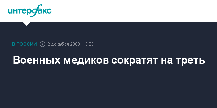 Москва. 2 декабря. INTERFAX.RU - Численность структур военной медицины в рамках формирования нового облика российской армии сократится примерно на 30%, заявляют в Минобороны РФ.