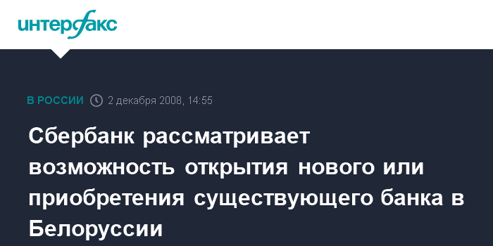 Москва. 2 декабря. INTERFAX.RU - Сбербанк Российской Федерации в ближайшее время рассмотрит возможность открытия нового или приобретения существующего в Белоруссии банка, заявил председатель правления Сбербанка Российской Федерации Герман Греф журналистам во вторник в Минске после встречи с президентом Александром Лукашенко.
