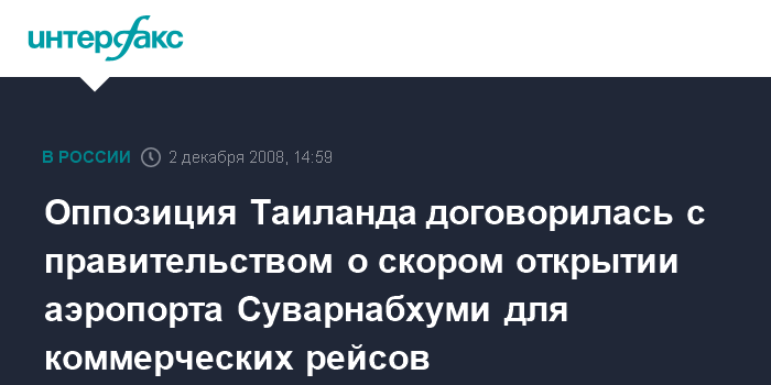 Москва. 2 декабря. INTERFAX.RU - Лидеры антиправительственных выступлений в Таиланде объявили во вторник о готовности открыть терминал аэропорта Суварнабхуми для коммерческих рейсов.