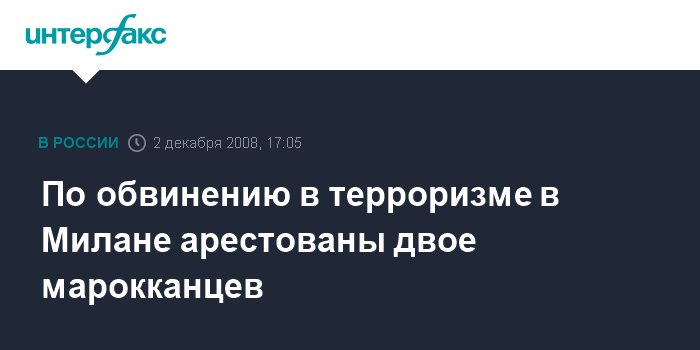 Москва. 2 декабря. INTERFAX.RU - Двое человек арестованы в Милане во вторник по обвинению в терроризме, сообщает интернет-сайт итальянской газеты "Репубблика".