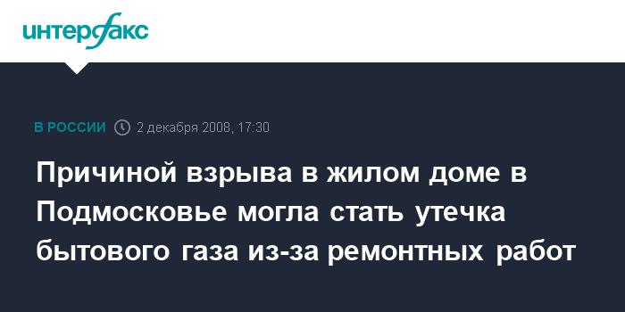 Москва. 2 декабря. INTERFAX.RU - Причиной взрыва в жилом доме в Орехово-Зуевском районе Московской области могла стать утечка бытового газа, сообщил "Интерфаксу" во вторник источник в правоохранительных органах.