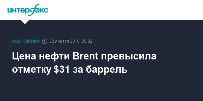 Москва. 22 января. INTERFAX.RU - Цена нефти марки Brent превысила отметку $31 за баррель в ходе торгов в пятницу, сообщает MarketWatch.