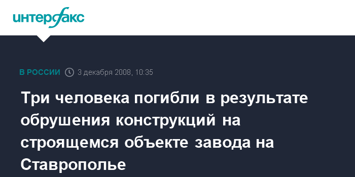 Москва. 3 декабря. INTERFAX.RU - В результате обрушения бетонных конструкций на территории Красногвардейского стеклотарного завода в Ставропольском крае три человека погибли, один получил ранения.