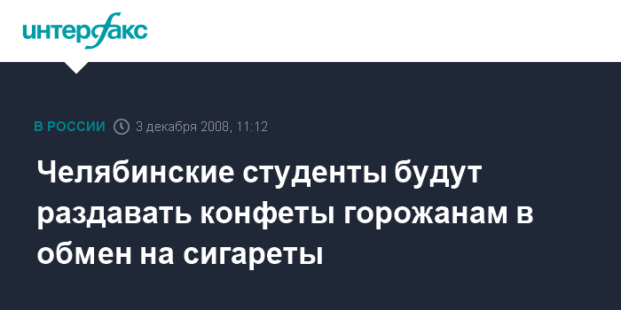 Москва. 3 декабря. INTERFAX.RU - Студенческая акция "Меняем сигареты на конфеты!" пройдет в Челябинске 4 декабря.
