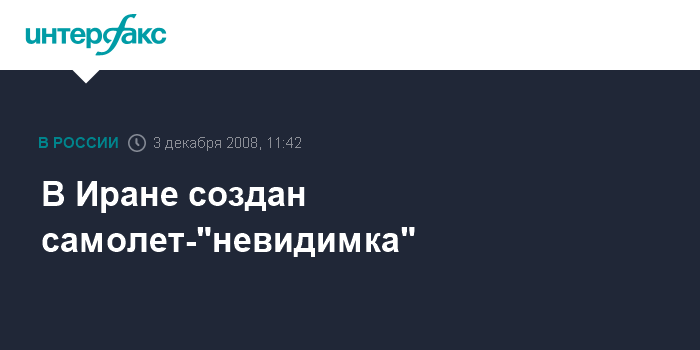 Москва. 3 декабря. INTERFAX.RU - Самолет-"невидимку" удалось создать иранским ученым, сообщает во вторник иранский телеканал "Пресс-ТВ", цитируя командующего ВВС Ирана Хасана Шах-Сафи.