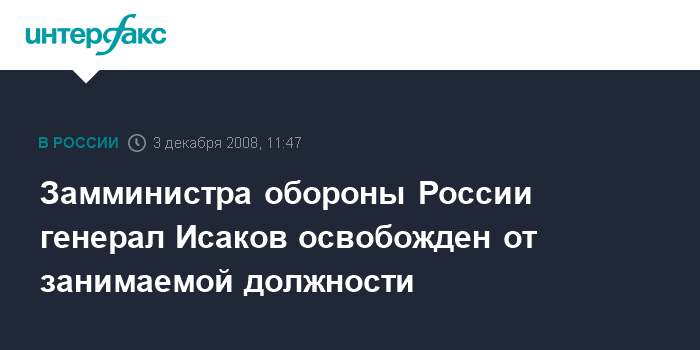 Москва. 3 декабря. INTERFAX.RU - Начальник Тыла Вооруженных сил - замминистра обороны РФ генерал армии Владимир Исаков освобожден от занимаемой должности, сообщили "Интерфаксу-АВН" в среду в российском военном ведомстве.