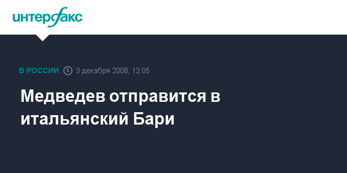 Москва. 3 декабря. INTERFAX.RU - Президент РФ Дмитрий Медведев посетит Италию (город Бари) с рабочим визитом 6 декабря, сообщили "Интерфаксу" в пресс-службе Кремля.