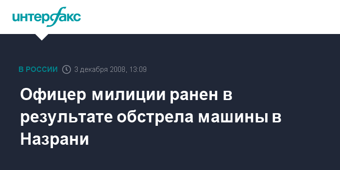 Москва. 3 декабря. INTERFAX.RU - В центре Назрани неизвестные обстреляли автомашину подполковника милиции, начальника смены дежурной части МВД Ингушетии Исы Евлоева. Офицер получил ранение.