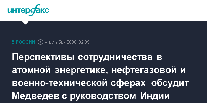 Перспективы сотрудничества в атомной энергетике, нефтегазовой и военно-технической сферах обсудит Медведев с руководством Индии