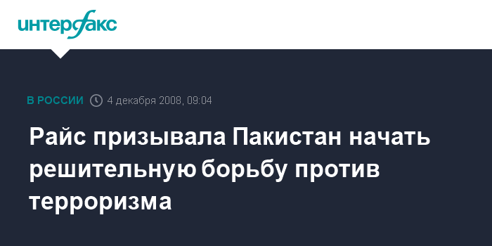 Москва. 4 декабря. INTERFAX.RU - Госсекретарь США Кондолиза Райс призывает Пакистан приступить к решительной борьбе против терроризма, передает британская телерадиокорпорация Би-Би-Си.