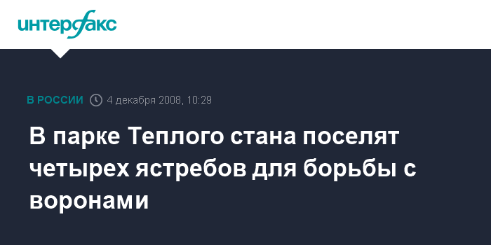 Москва. 4 декабря. INTERFAX.RU - В ландшафтном заказнике "Теплый стан" на юго-западе столицы 5 декабря поселят четырех ястребов-тетеревятников, сообщили в четверг "Интерфаксу" в пресс-службе департамента природопользования и охраны окружающей среды Москвы.
