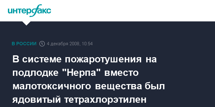 Москва. 4 декабря. INTERFAX.RU - В систему пожаротушения на атомной подлодке АПЛ "Нерпа", в результате срабатывания которой 8 ноября погибли 20 человек, на две трети была закачена примесь ядовитого вещества - тетрахлорэтилена, заявил главный инженер Амурского судостроительного завода (АСЗ) Александр Меринов со ссылкой на данные предварительного расследования инцидента.