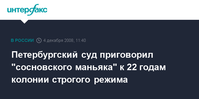 Москва. 4 декабря. INTERFAX.RU - Санкт-Петербургский городской суд приговорил Андрея Кийко, известного как "сосновский маньяк", к 22 годам лишения свободы с отбыванием наказания в колонии строгого режима.