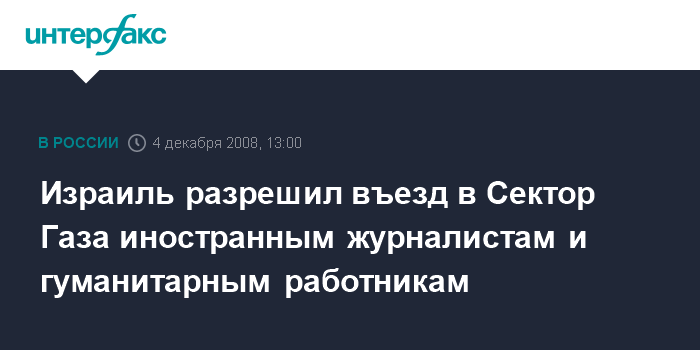 Москва. 4 декабря. INTERFAX.RU - Власти Израиля в четверг сняли действовавший в течение четырех недель запрет на въезд иностранных журналистов в Cектор Газа, сообщает израильская газета "Гаарец" со ссылкой на заявление представителя министерства обороны Израиля Петера Лемера.