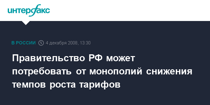 Москва. 4 декабря. INTERFAX.RU - Правительство РФ может потребовать от естественных монополий снижения темпов роста тарифов, заявил в ходе прямой линии премьер-министр РФ Владимир Путин.