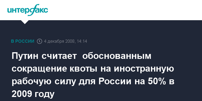 Москва. 4 декабря. INTERFAX.RU - Премьер России Владимир Путин предложил сократить на 50% квоту на привлечение иностранной трудовой силы с учетом мирового финансового кризиса.