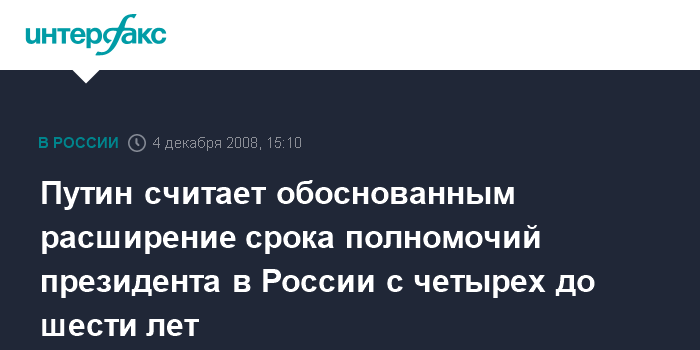 Москва. 4 декабря. INTERFAX.RU - Премьер-министр России Владимир Путин считает обоснованными предложения президент РФ Дмитрия Медведева об увеличении сроков мандатов президента и Госдумы.