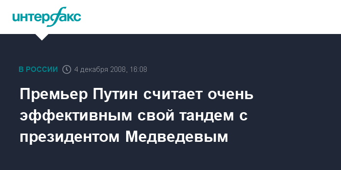 Москва. 4 декабря. INTERFAX.RU - Премьер-министр РФ Владимир Путин положительно оценил то, как осуществляется его взаимодействие с президентом Дмитрием Медведевым.