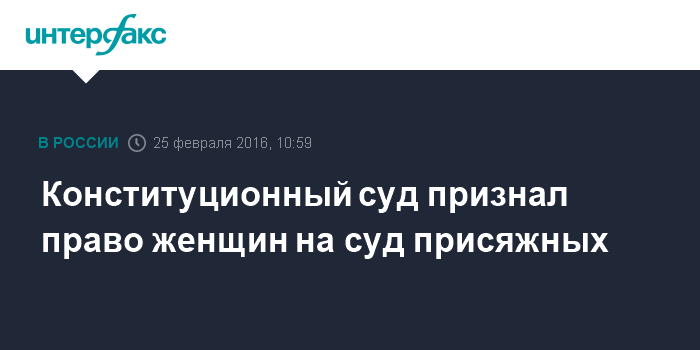 Москва. 25 февраля. INTERFAX.RU - Конституционный суд РФ признал противоречащими Конституции нормы уголовно-процессуального кодекса, согласно которым женщины лишены права на суд присяжных.