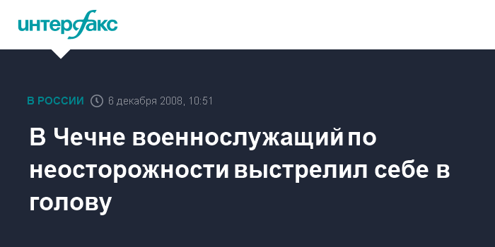 Москва. 6 декабря. INTERFAX.RU - В Чечне военнослужащий в результате неосторожного обращения с оружием выстрелил себе в голову, он скончался, сообщил "Интерфаксу" источник в правоохранительных органах.