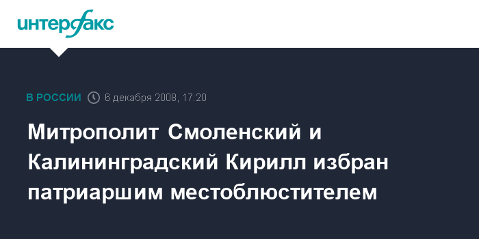 Москва. 6 декабря. INTERFAX.RU - Местоблюстителем Московского патриаршего престола избран митрополит Смоленский и Калининградский Кирилл. Такое решение принял на экстренном заседании в субботу Священный Синод Русской православной церкви в подмосковной патриаршей резиденции в Переделкино, сообщили "Интерфаксу" в пресс-службе Московской патриархии.