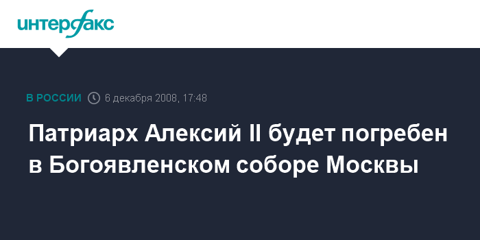 Москва. 6 декабря. INTERFAX.RU - Погребение патриарха Московского и всея Руси Алексия II состоится во вторник в 13:00 в московском Богоявленском соборе. "Погребен будет Святейший патриарх в Богоявленском соборе в 13:00", - сказал журналистам по итогам заседания Священного Синода глава пресс-службы Московской патриархии Владимир Вигилянский. Он также добавил, что отпевание Алексия II состоится в тот же день, во вторник, в храме Христа Спасителя.