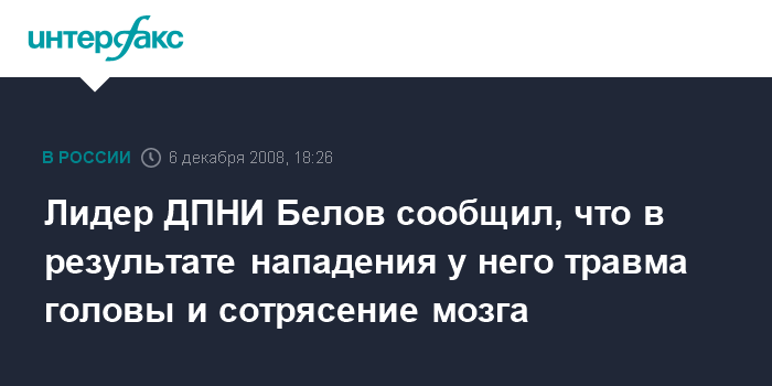 "Около часа дня мы приехали в Люберцы, чтобы встретиться с группой молодых людей - наших соратников. В районе стадиона на нас напали около 15 человек. Они были вооружены арматурой, битами, кастетами, В результате нападения я получил несколько ударов сзади по голове. Потерял сознание и очнулся уже в больнице", - сказал Белов. Источник "Интерфакса" в правоохранительных органах Подмосковья подтвердил факт нападения на А.Белова.