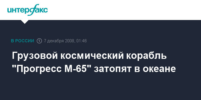 Москва. 7 декабря. ИНТЕРФАКС-АВН - Загруженный мусором космический грузовой корабль "Прогресс М-65" в воскресенье утром будет захоронен на так называемом "кладбище космических кораблей" в Тихом океане, сообщили "Интерфаксу-АВН" в Центре управления полетами.