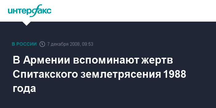 Ереван. 7 декабря. INTERFAX.RU - В Армении 7 декабря проходят траурные мероприятия по жертвам Спитакского землетрясения 1988 года. 20 лет назад природная стихия уничтожила город Спитак в северной части Армении.