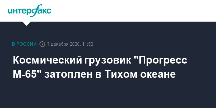 Москва. 7 декабря. INTERFAX.RU - Элементы грузового космического корабля "Прогресс М-65" затоплены на так называемом кладбище космических кораблей в Тихом океане, сообщили "Интерфаксу-АВН" в воскресенье в Центре управления полетами (ЦУП).