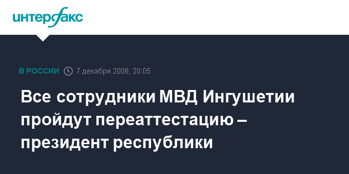 Назрань. 7 декабря. ИНТЕРФАКС-ЮГ - Все сотрудники органов внутренних дел Ингушетии, начиная с руководящего состава и кончая рядовыми милиционерами, пройдут аттестацию на соответствие занимаемым должностям, заявил президент республики президент Юнус-Бек Евкуров.
