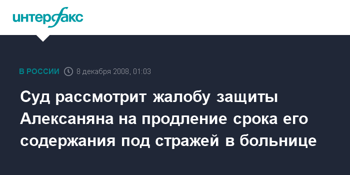 Москва. 8 декабря. ИНТЕРФАКС - Мосгорсуд рассмотрит в понедельник жалобу защиты бывшего вице-президента НК "ЮКОС" Василия Алексаняна на продление до 22 января срока его содержания под стражей в больнице.