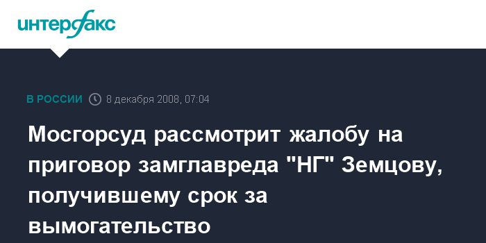 Москва. 8 декабря. ИНТЕРФАКС - Мосгорсуд вернется к рассмотрению жалобы защиты на приговор заместителю главного редактора "Независимой газеты" Борису Земцову, осужденному на 8 лет заключения за вымогательство.