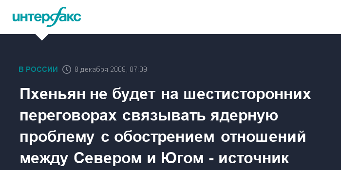 Пхеньян не будет на шестисторонних переговорах связывать ядерную проблему с обострением отношений между Севером и Югом - источник