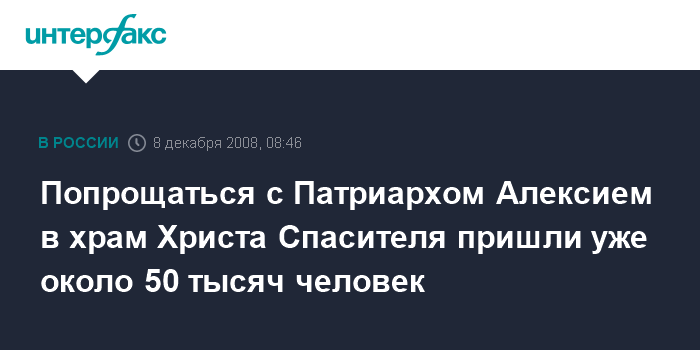 Москва. 8 декабря. INTERFAX.RU - Около 50 тысяч человек пришли в выходные дни и в ночь на понедельник в храм Христа Спасителя, в котором находится гроб с телом патриарха Московского и Всея Руси Алексия II, сообщил "Интерфаксу" в понедельник источник в правоохранительных органах столицы.