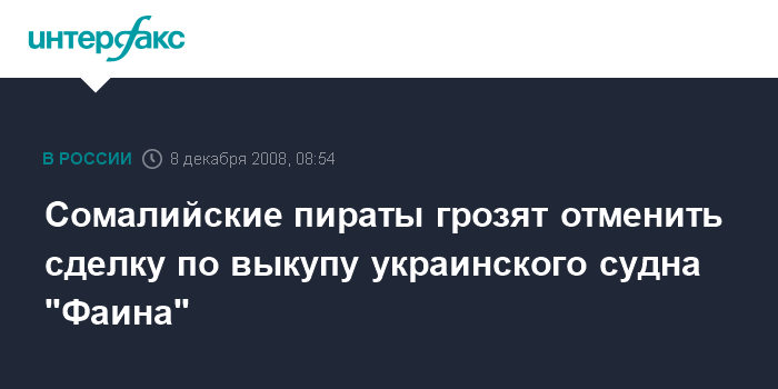 Москва. 8 декабря. INTERFAX.RU - Сомалийские пираты крайне недовольны задержкой выкупа за украинское судно "Фаина" с вооружением на борту, сообщил телеканал "Вести-24".
