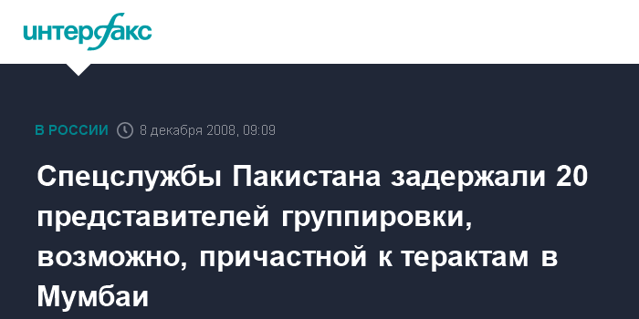 Спецслужбы Пакистана задержали 20 представителей группировки, возможно, причастной к терактам в Мумбаи