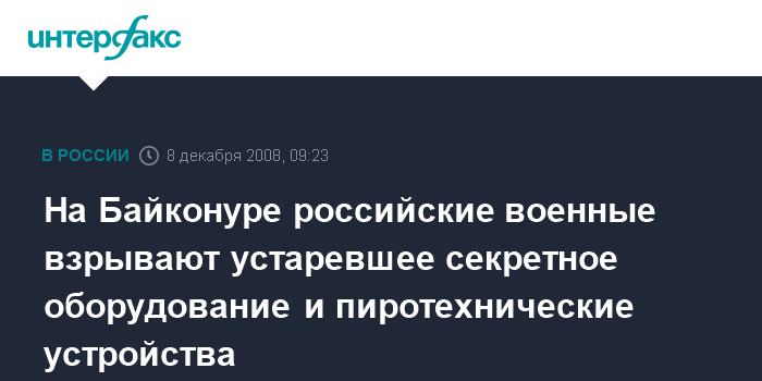 Москва. 8 декабря. INTERFAX.RU - На Байконуре российские военные ведут работы по ликвидации секретного оборудования и пиротехнических устройств, выслуживших установленные сроки службы, сообщил агентству "Интерфакс-Казахстан" источник на космодроме в понедельник.
