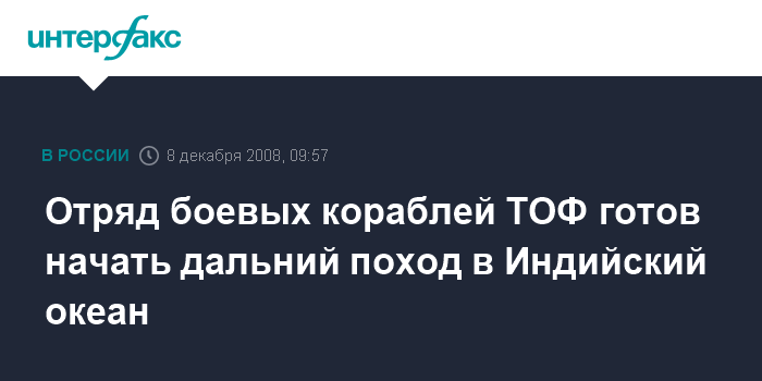 Москва. 8 декабря. INTERFAX.RU - Экипажи кораблей Тихоокеанского флота (ТОФ), которым предстоит провести в Индийском океане совместные маневры с ВМС Индии в рамках военно-морских учений "Индра-2009", завершили подготовку к походу.
