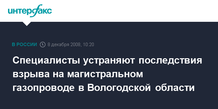 Москва. 8 декабря. INTERFAX.RU - Ремонтные бригады ведут работы на магистральном газопроводе высокого давления "Грязовец - Санкт-Петербург" в Вологодской области, где в субботу произошел взрыв, сообщили "Интерфаксу" в региональном МЧС.