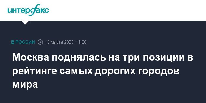 Цюрих. 19 марта. INTERFAX.RU - Москва поднялась в рейтинге самых дорогих городов мира на 38-е место с 41-го, которое она занимала в 2006 году. Этот список ежегодно составляет агентство Bloomberg на основе данных банка UBS.