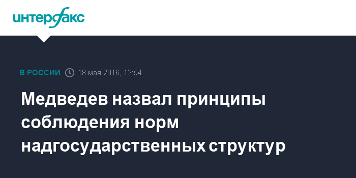 Москва. 18 мая. INTERFAX.RU - Глава российского правительства Дмитрий Медведев считает, что при реализации правовых норм надгосударственных структур должны учитываться интересы России.